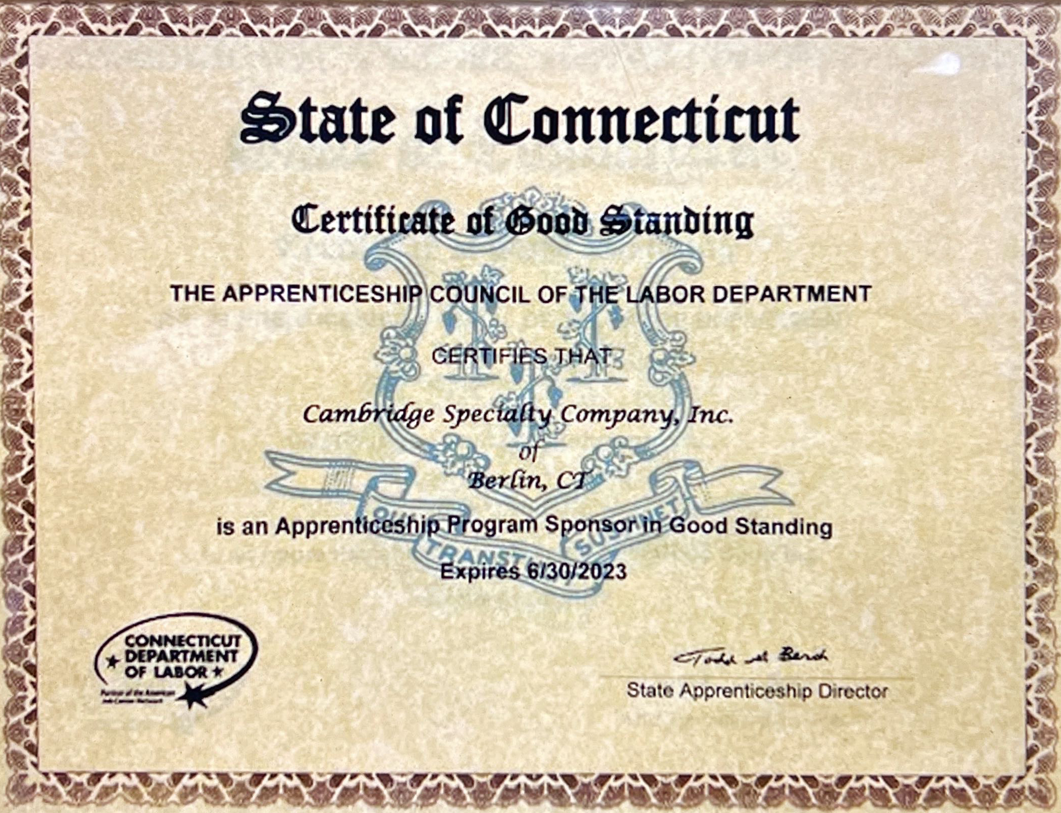 Cambridge Specialty Company has embarked on a journey with the CT Department of Labor by actively utilizing the Connecticut Apprenticeship Program. This program combines supervised structured on-the-job training with classroom instruction. Employees (Apprentice) are employed by the company, mentored by skilled journey supervisors, challenged by learning a trade in this âNationally Recognized Certification of Skillsâ. Today Cambridge has (5) active Apprentice Employees in the program. (see photo)